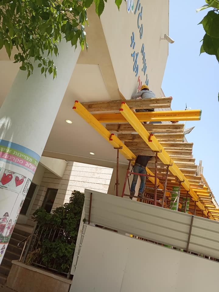 פועלים עובדים עם ציוד כבד בידיהם מעל ראשי הילדים בכניסה הראשית למתחם,ללא כל מעבר בטוח או הגנה על היקרים לנו מכל.עד כאן!