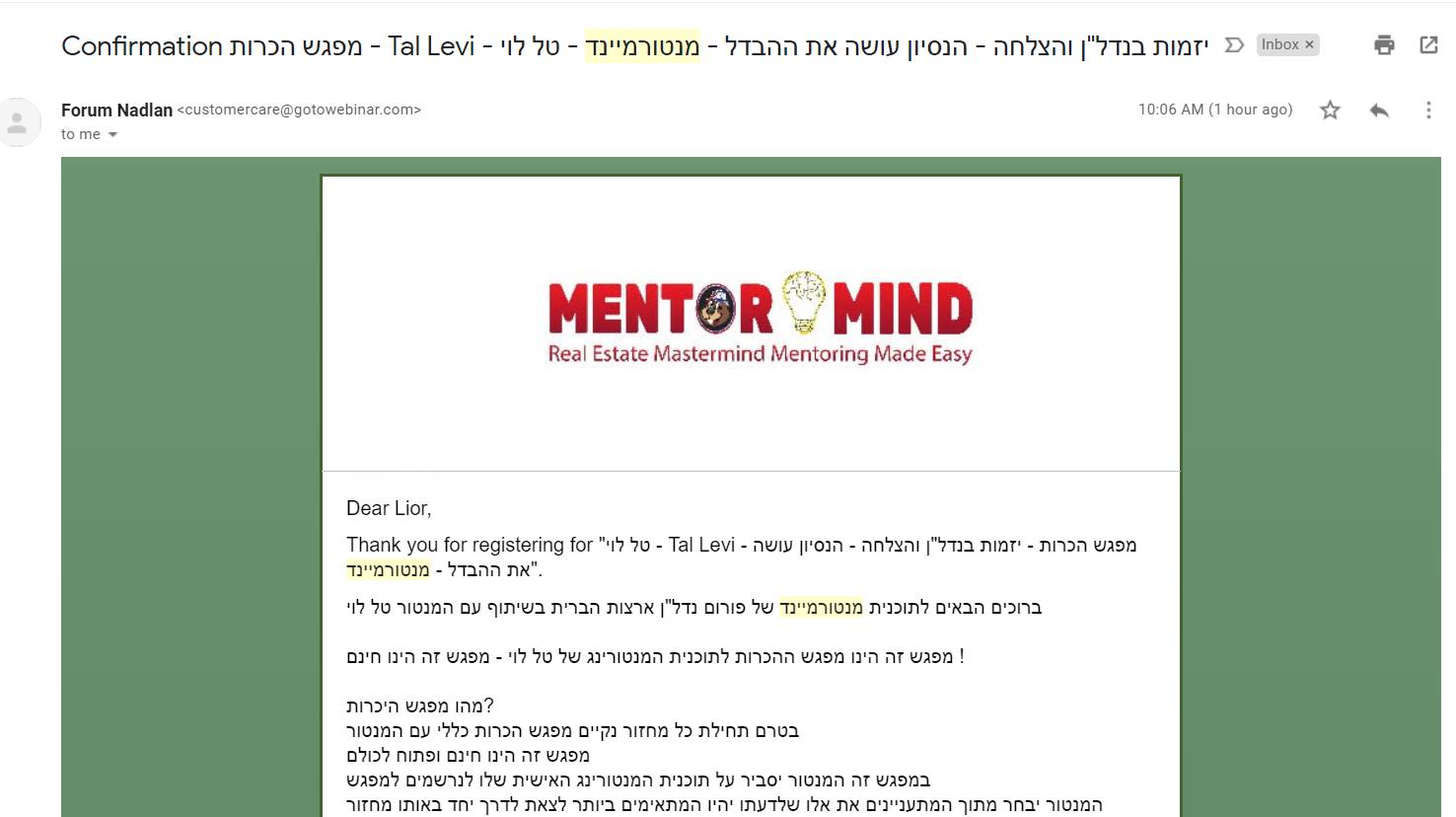 הודעה לכל מי שנרשם לוובינר היום בשעה 8 לגבי תוכנית מנטורמיינד עם טל לוי – כך תצט…