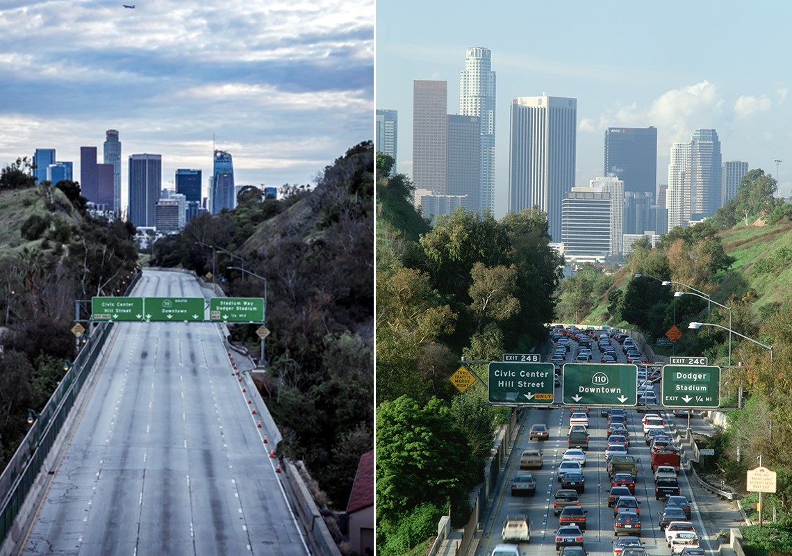 לפי נתוני משרד התחבורה בקליפורניה (Caltrans), בשבועות האחרונים (מאז ה-18 במרץ) חלה הפחתה של כ-71% בכמות הרכבים הנוסעים בכבישים המהירים של לוס אנג'לס בשעות העומס. בסוכנות להגנת הסביבה (EPA) הוסיפו כי העיר רשמה השבוע את כמות הימים הרצופים בעלי "רמת זיהום אוויר נמוכה" הגדולה ביותר מאז 1980.